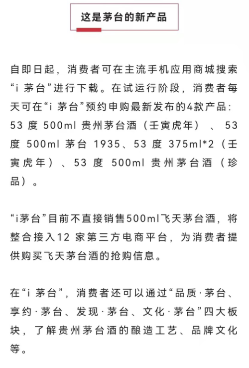 此外,消息还称,“‘i茅台’目前不直接销售500ml飞天茅台酒,将整合接入12 家第三方电商平台,为消费者提供购买飞天茅台酒的抢购信息。”