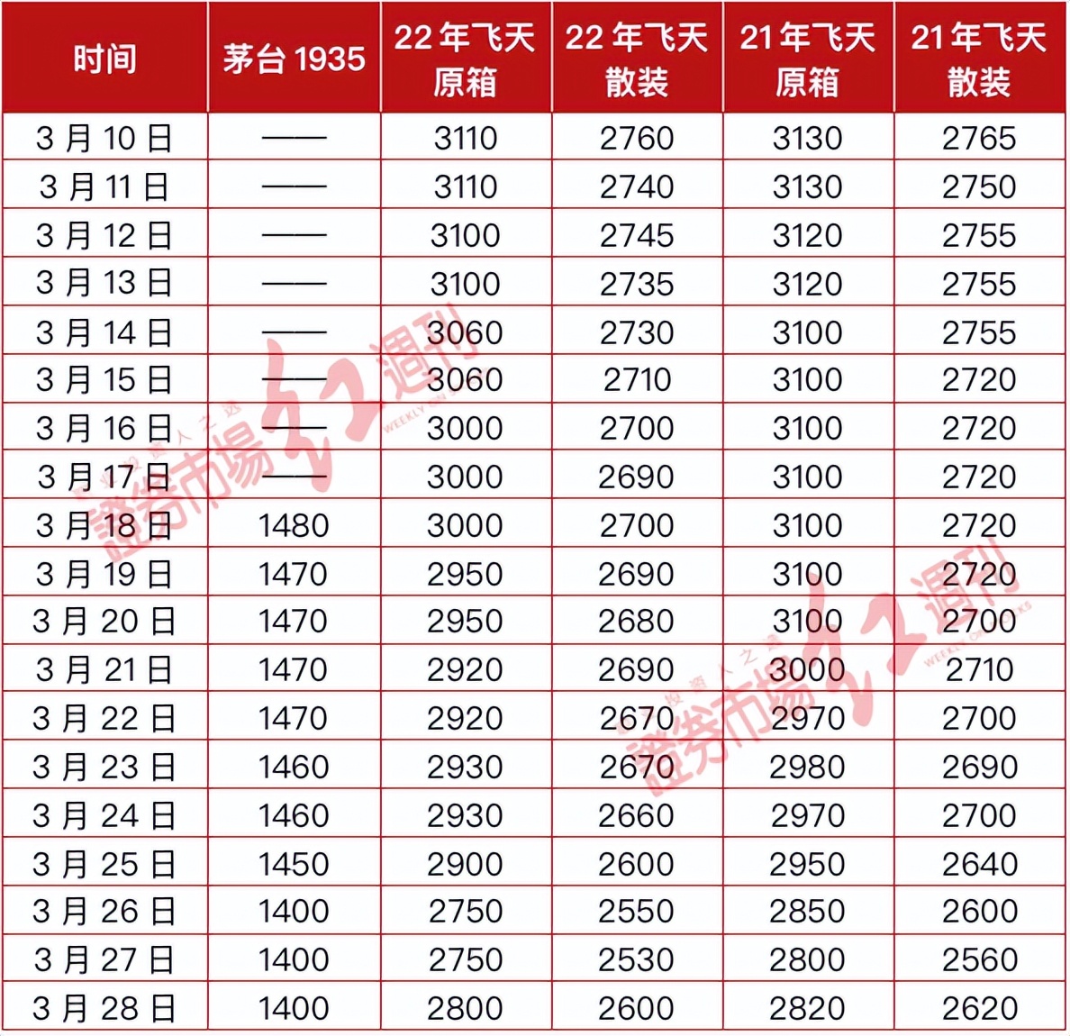 据公开资料显示,在3月10日,22年飞天原箱、22年飞天散装、21年飞天原箱和21年飞天散装的行情价(酒商调货价)分别为3110元/瓶、2760元/瓶、3130元/瓶和2765元/瓶,至3月28日,已分别降至2800元/瓶、2600元/瓶、2820元/瓶和2620元/瓶。其中,22年飞天原箱和21年飞天原箱的降价规模最大,均为310元/瓶(见附表)。