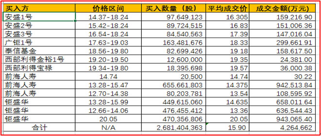 截至停牌日,宝能一共买入26.81亿股万科A股票,耗费的资金大约为426亿元,如下表。