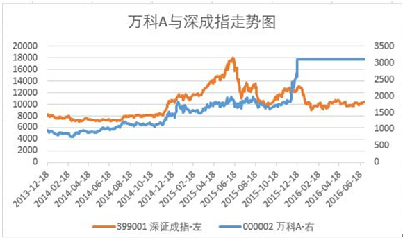 下图是万科A股价与深成指的历史走势图。大部分时间里面,二者的走势是基本一致的,并不会有太大偏差。然而,从去年7月初以来,宝能系资金增持以及投资者的跟风,让万科A的股价遥遥领先于深成指走势。