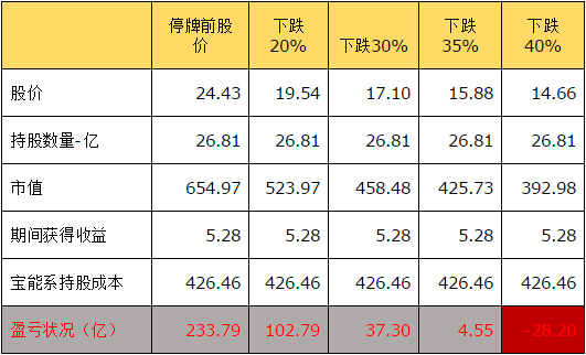 再看复牌后,宝能到底会不会赔钱呢?宝能系资金共计持有的万科A26.81亿股股票,按照停牌前24.43亿元测算,合计市值为655亿元。假定四种情形来看宝能资金的盈亏状况。
