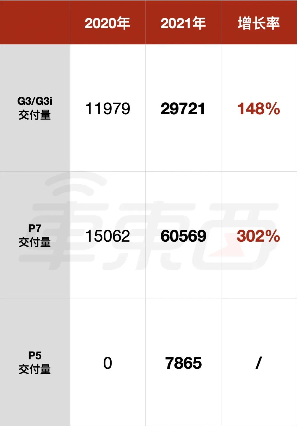 在全年交付的98155台车中,包括29721辆G3/G3i车型,60569辆P7以及7865辆P5,与2020年相比,2021年P7车型的交付量同比大涨302%,仍然为交付量最多的车型。