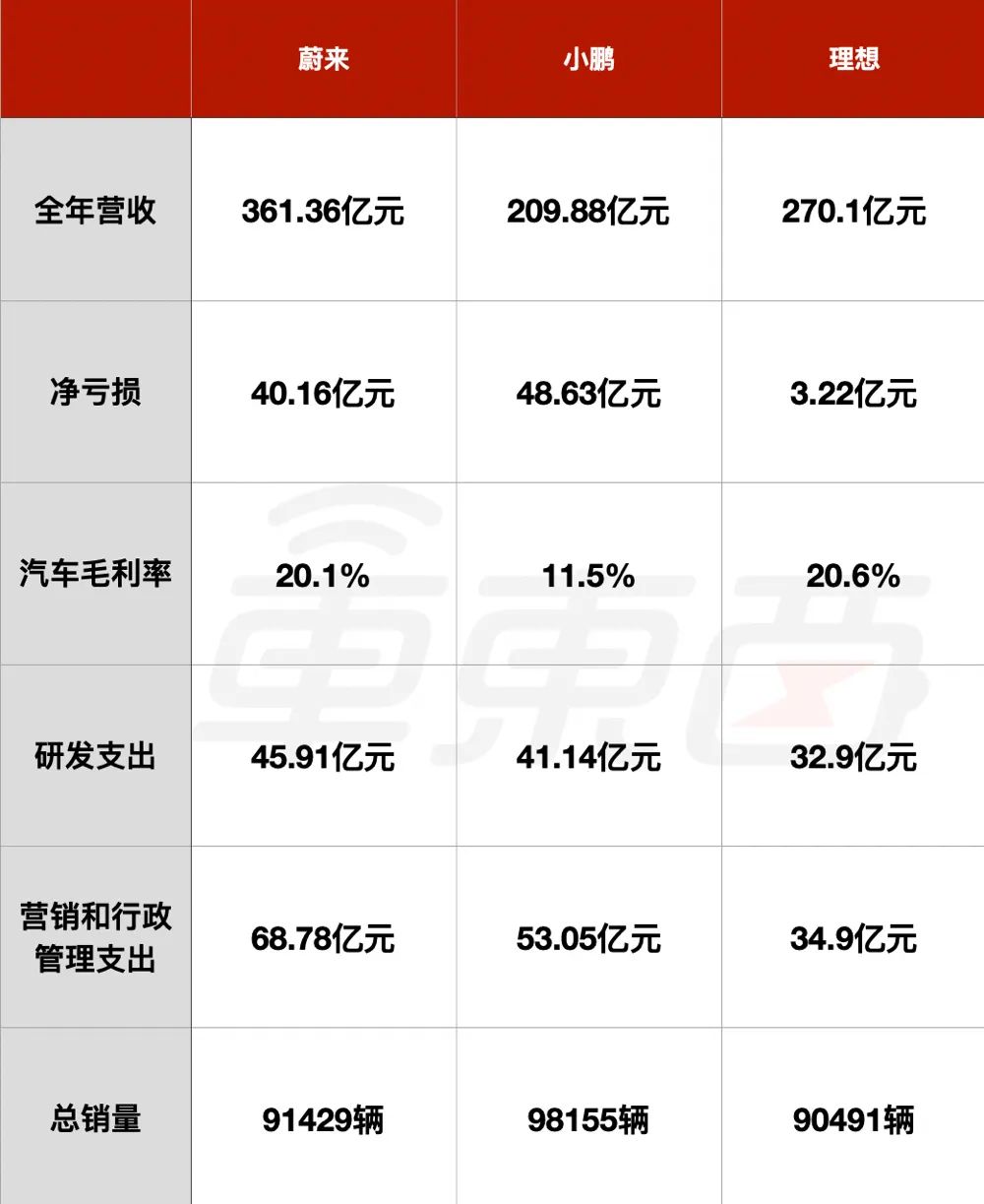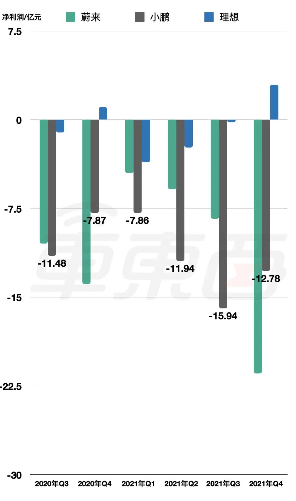 纵观蔚小理三家,只有理想汽车在2020年第四季度和2021年第四季度实现过盈利,毕竟理想汽车被坊间誉为“抠厂”,短暂实现盈利实属不易。而蔚来和小鹏汽车一直属于亏损状态,至今还没有实现盈利。
