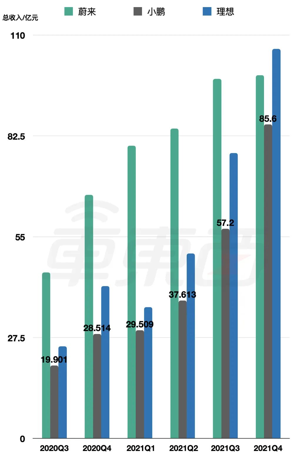 在总收入方面,2021年第四季度小鹏汽车的总收入为85.6亿元,同比增长200.1%,环比增长49.6%。