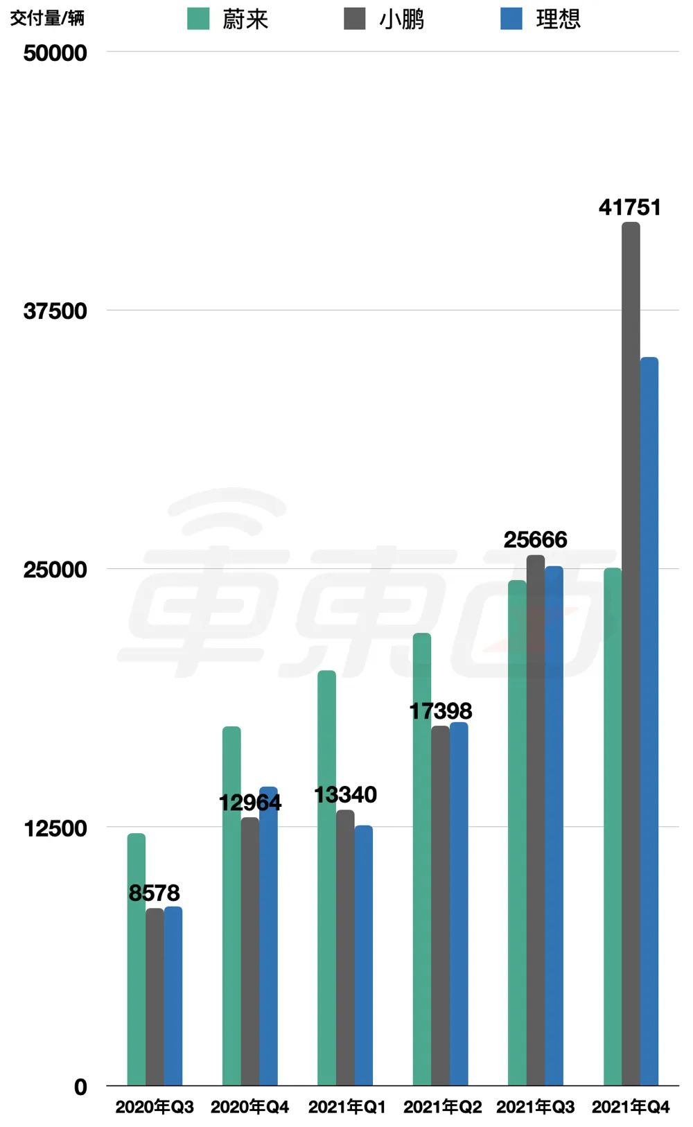 与蔚来和理想相比,小鹏汽车在2021第四季度的交付量达到了41751辆,环比增长63%,同比增长222%,为三家中最高,优势较为明显。