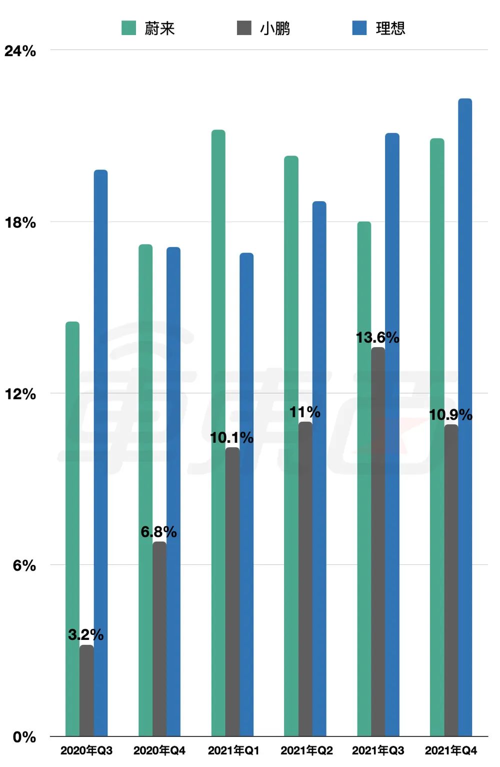 所以,在2021年第四季度,小鹏汽车的汽车毛利率为10.9%,比2021年第三季度的13.6%下降2.7%。而得益于旗下车型相对较高的售价,蔚来和理想去年第四季度的汽车毛利率基本上还保持在20%左右。
