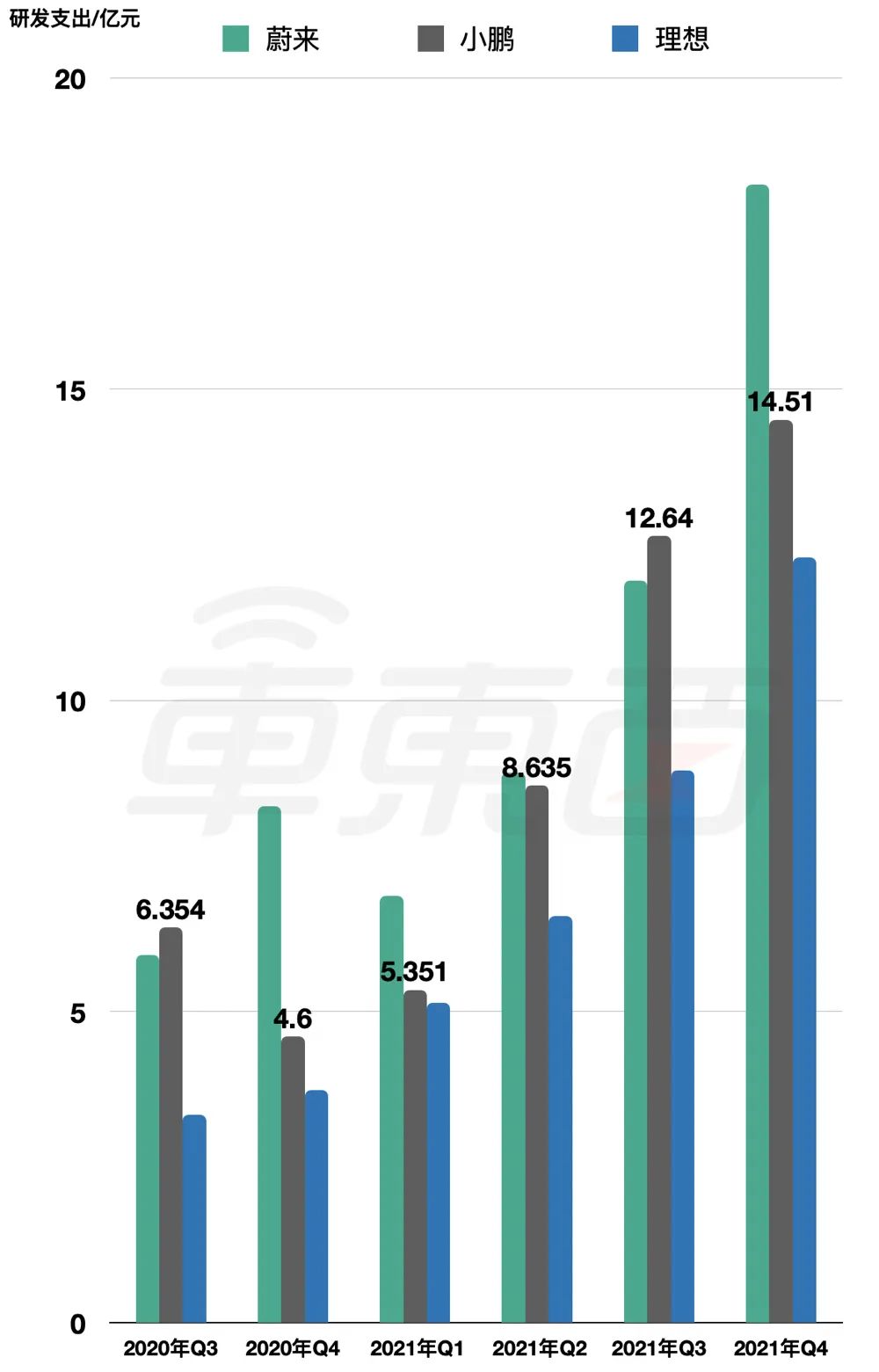 在研发支出方面,2021年第四季度小鹏汽车的研发支出再创新高,达到了14.51亿元。在过去六个季度,小鹏汽车的研发支出一直与蔚来汽车不相上下,两家基本上处于胶着状态。