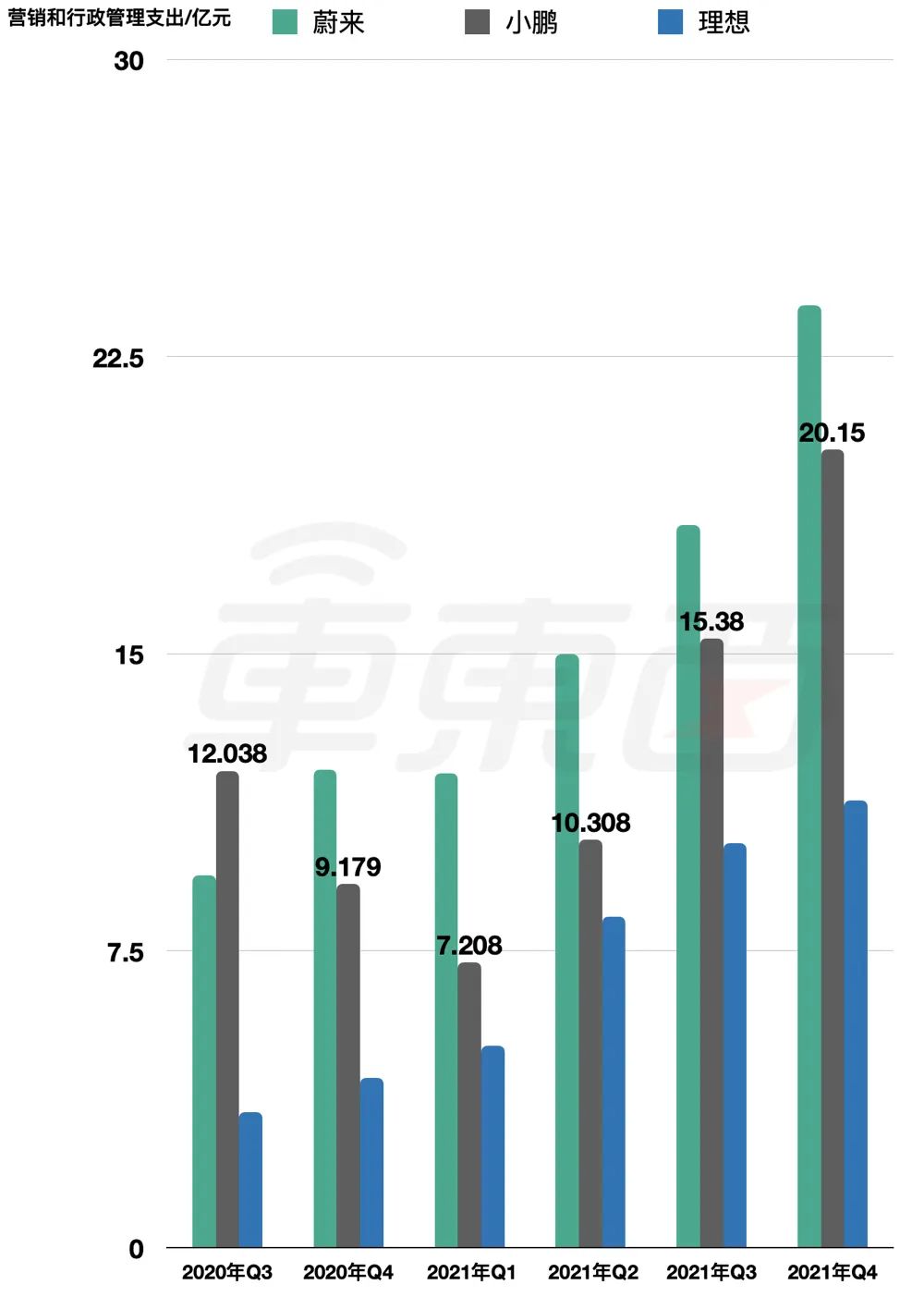 除了研发支出外,2021年第四季度小鹏汽车在营销和行政管理支出也再创新高,达到了20.154亿元,已经接近蔚来汽车在这方面的支出。