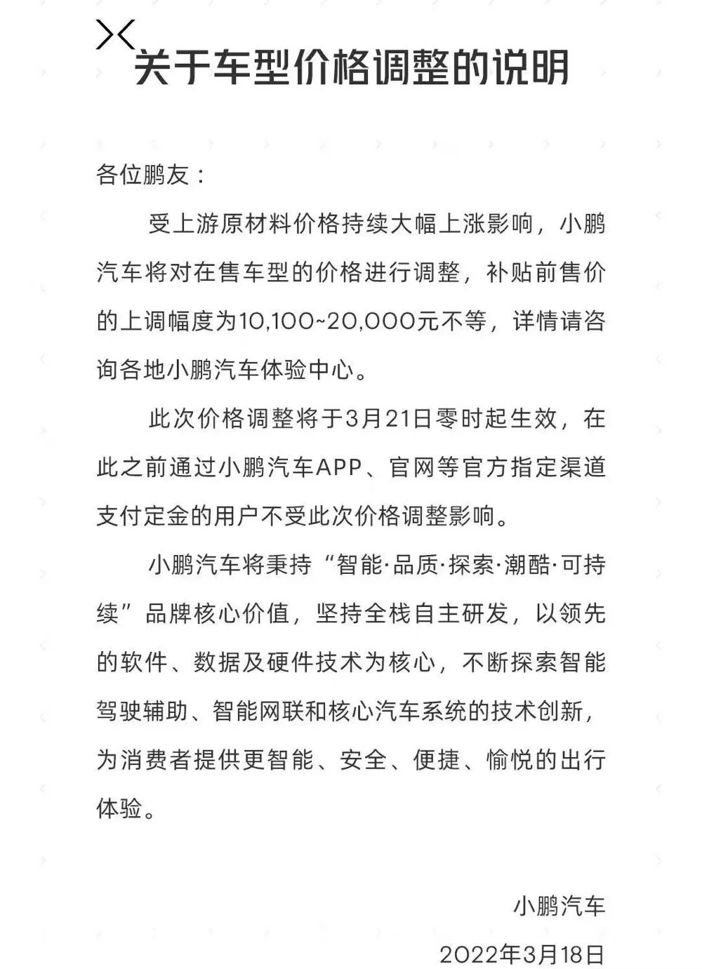 但是2022年伊始,由于受到上游原材料价格持续大幅上涨的影响,小鹏汽车对在售车型的价格进行调整,补贴前售价的上调幅度为10100~20000元不等,涉及小鹏P7、P5、G3i三款车型。