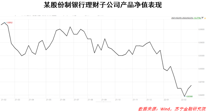 从以下图某股份制银行理财子公司某只产品净值表现来看,这类开放性的净值产品波动大,适用的风险等级高。该产品在2021年2月5日成立,在成立后近一年的时间内,亏损近20%,与同期沪深300指数跌幅为24%相类似。无论是产品定位还是产品投向、业绩表现都与市场中其他权益类产品并无二致。这类产品多数为开放型产品,净值真实体现了所投资产的市场价值,当投资者难以忍受产品净值的大幅度下跌时,部分会选择卖出止损。