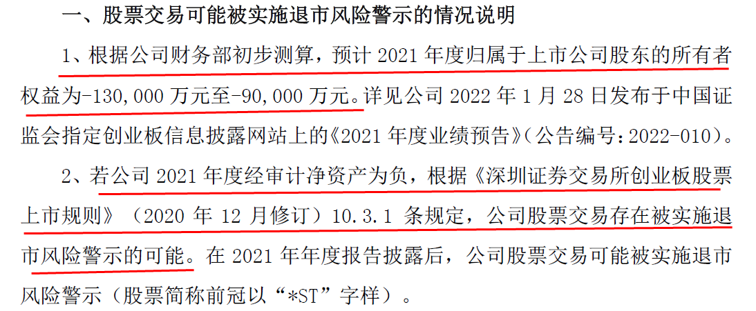 今年以来,公司多次发布退市风险警示,称因预计2021年度期末净资产为负值,根据相关规定,公司股票交易可能被实施退市风险警示(股票简称前冠以“*ST”字样)。