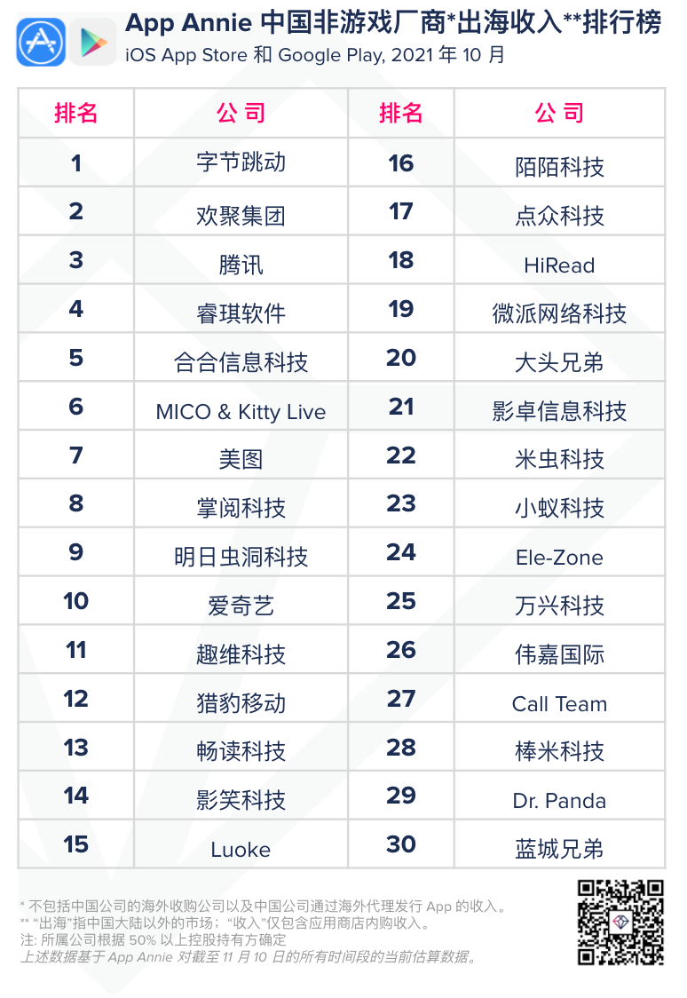 根据APP Annie《2022年2月中国游戏厂商出海收入榜》,字节跳动收购的沐瞳科技、有爱互娱,分别位列第十二、第二十五。
