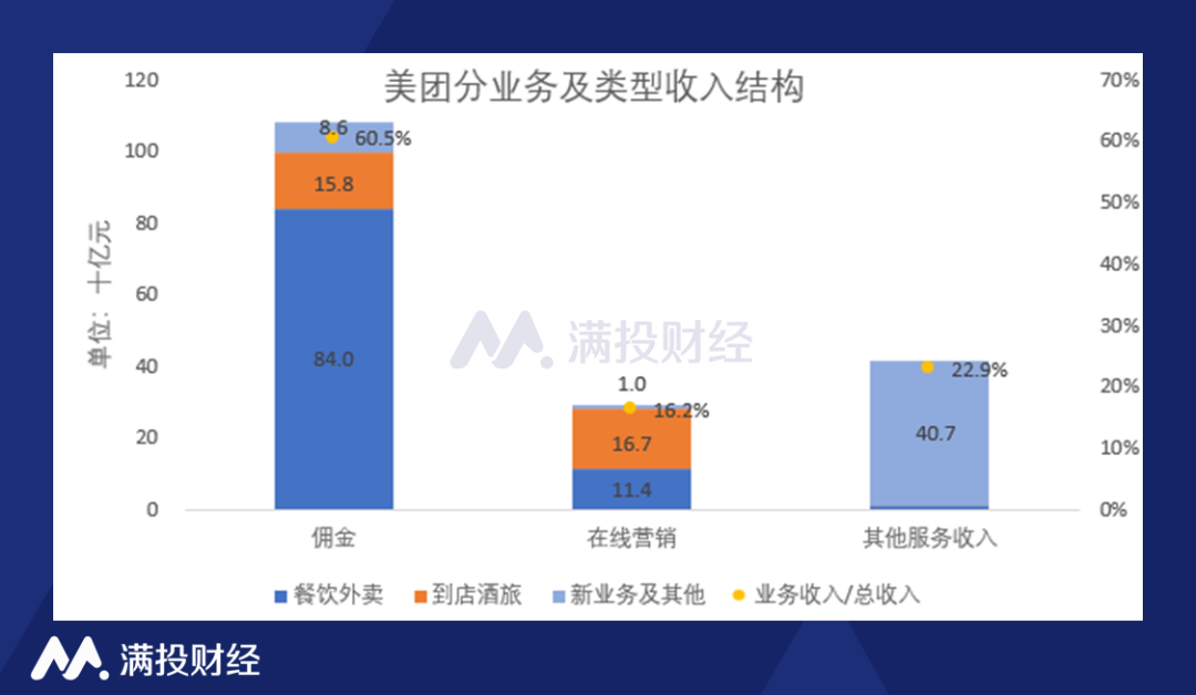 按业务类型分,公司2021年财报首次将“餐饮外卖配送服务”从“佣金”项中剔除,单独进行统计(本文为与前年比较,故合并为佣金项),餐饮外卖依然是佣金收入的主要来源;到店酒旅业务则依旧主要由广告、营销收入产生的收入构成;以社区团购为主的新业务占总收入比重达到了22.9%,成为公司收入的重要来源之一。