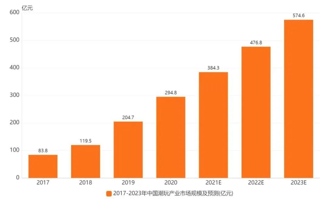 针对年轻人的潮玩在近十年来大行其道,并带动了“潮玩经济”的发展,市场容量不断快速增长。据不完全统计,目前国内以“潮玩”为主营业务的大小企业有近千家,整个市场规模以百亿计。