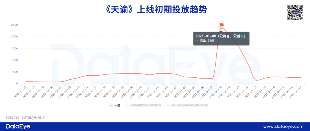 《天谕》在预热阶段采用了大致相同的投放策略,游戏上线前夕,项目组以日均300余组的效果广告进行宣传推广,但预热时间较短,大约只有半个月时间。对比《庆余年》,《天谕》或许因为其端游产品具有一定的名气,没必要进行过长的预热投放。