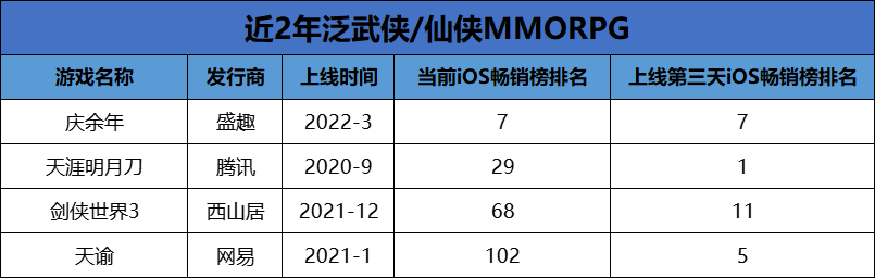 从市场格局来看:顶级大厂与品类老牌厂商的对决。根据DataEye研究院整理显示,目前畅销榜TOP100中,近2年推出泛武侠MMORPG产品屈指可数。