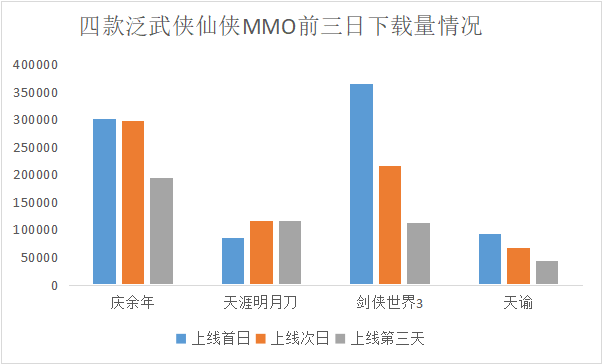 21年底上线的《剑侠世界3》在首日获得超过36万次下载,排名其余三款同类型题材之首,不过下载量在次日和第三日出现明显下滑。作为对比,《庆余年》上线三天的总量不仅排名第一,而且整体下载量稳定,即使是第三天出现回落也领先同类型产品。