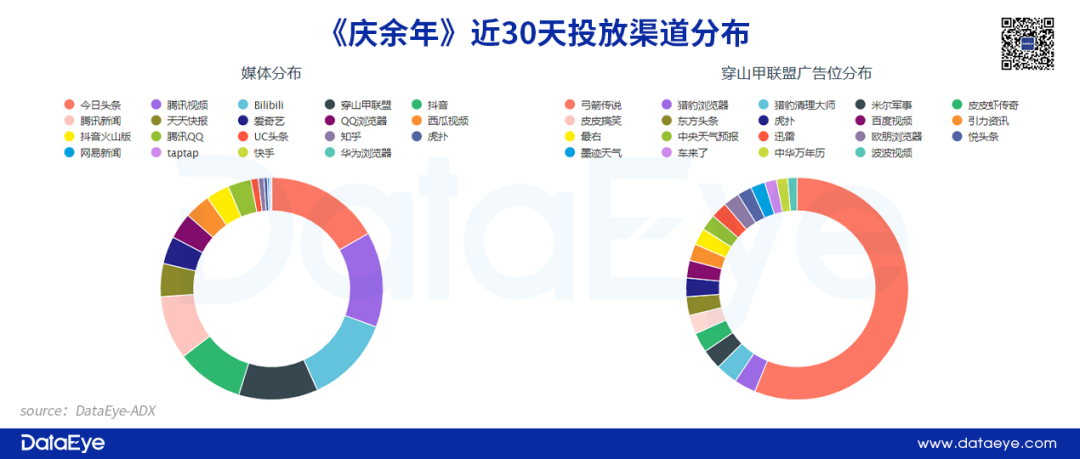 从投放渠道来看:B站成为重点投放渠道。根据DataEye-ADX数据显示,近30天《庆余年》投放TOP3渠道分别是:今日头条、腾讯视频以及BiliBili。对比其他产品,《庆余年》加大了在年轻人为主的B站上投放。
