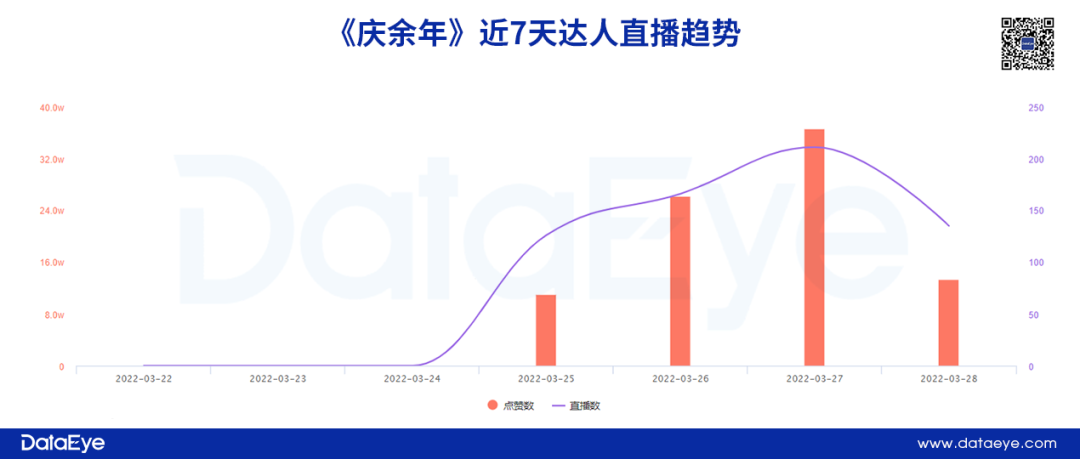 从达人直播曝光来看:跳出舒适圈,尝试直播营销。根据DataEye-ADX达人营销分析数据显示,《庆余年》在游戏上线之后开启了达人直播营销,目前共直播638场,合作达人接近300位,总点赞也有超过80W次。