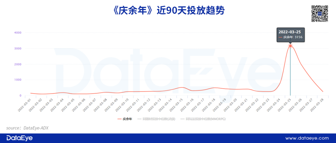 上线初期投放趋势:用较长预热铺垫抢夺注意力。根据DataEye-ADX数据显示,《庆余年》在2月中旬以日均200余组的效果广告进行产品的预热,在游戏上线前一天,投放量便上升到700余组。而在游戏上线当天,项目组单日超过3000组素材进行投放,试图争夺用户注意力。