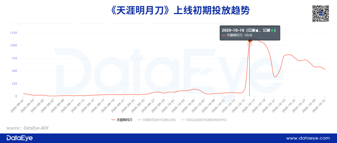 相比之下,腾讯《天刀》在产品预热阶段的投放力度更低,游戏上线前一个月日均投放量不足百组。可是在游戏上线后,单日投放超过1000组,并且后续投放相对稳定。