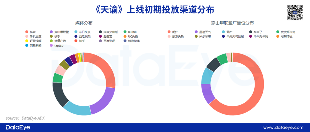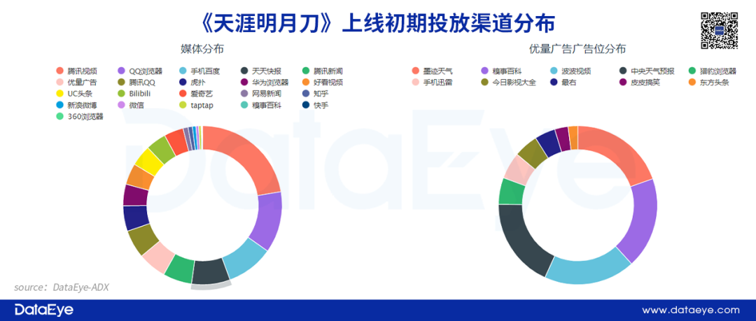 相比之下,无论是腾讯的《天刀》还是网易的《天谕》,在产品上线初期,投放渠道出现明显的侧重,例如网易《天谕》以字节系渠道为主,投放占比接近75%。《天刀》虽然以腾讯系为主要投放渠道,但投放分布相对均匀。