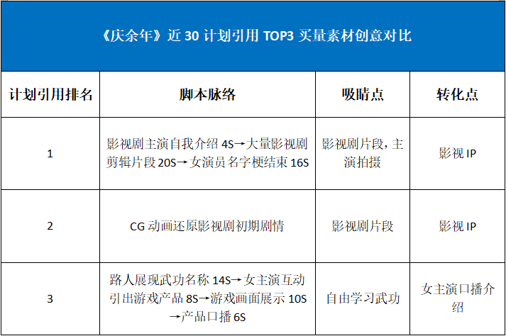 从创意素材来看:影视剧元素大量融入创意素材。通过DataEye研究院对《庆余年》近30天引用计划数TOP3的创意素材进行整理: