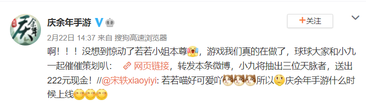 从社交媒体曝光来看:影视剧主演现身带热度。作为电视剧《庆余年》的主演之一,演员“宋轶”在微博社交平台上亲自转发了手游官微的一条微博,并且公开“询问”《庆余年》手游何时上线,带动影视剧粉丝主动关注手游动态,在影视剧粉丝圈层中有大量的曝光。