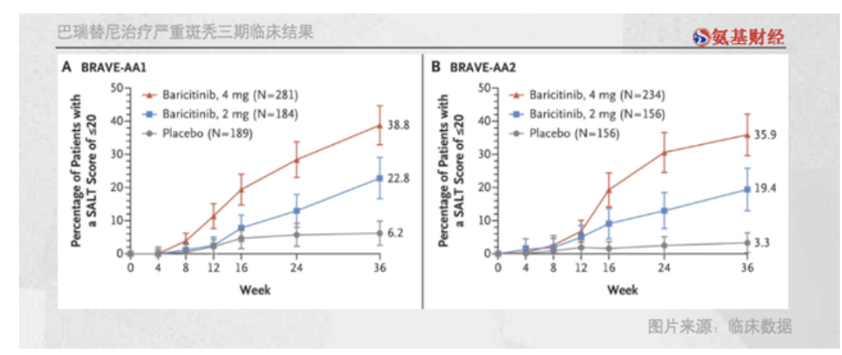 在BRAVE-AA1组中,4mg巴瑞替尼、2mg巴瑞替尼以及安慰剂组中,SALT评分小于等于20的比例分别为38.8%、22.8%、6.2%,BRAVE-AA2分别为35.9%,19.4%和3.3%。