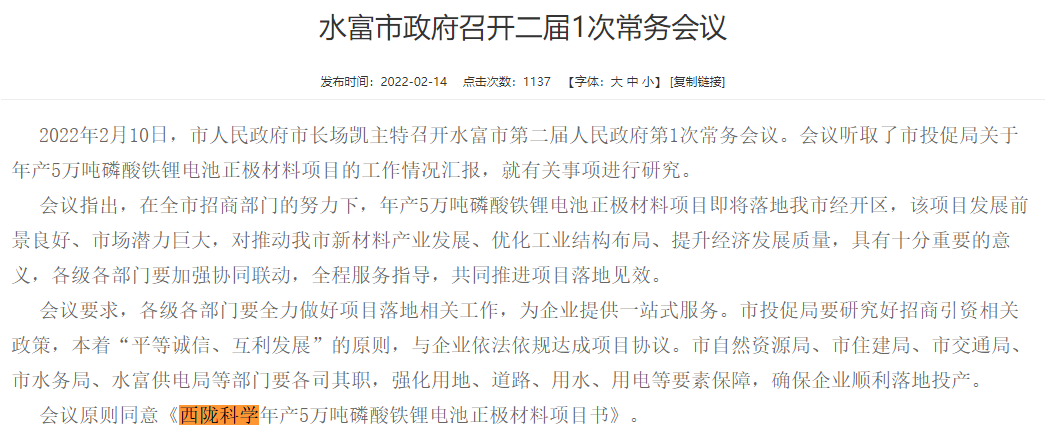 值得一提的是,西陇科学切入新能源赛道的预期早就存在,如今终于落地。今年2月14日水富是政府官网显示,“年产5万吨磷酸铁锂电池正极材料项目即将落地我市经开区,会议原则同意《西陇科学年产5万吨磷酸铁锂电池正极材料项目书》”。
