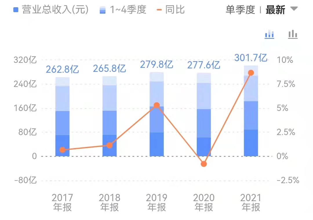 在中国啤酒行业高端化元年,得益于顺应国内啤酒市场消费升级趋势,销量增长,青岛啤酒(600600.SH)2021年营收突破300亿元。