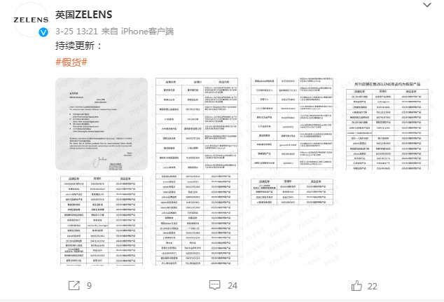 早在今年1月,青眼号外就注意到Zelens在官方微博上发布了一则声明,称销售正品渠道仅包括4个,同时公布了一长串假冒店铺名单,彼时有61家网店被曝光。不到3个月时间,这份名单已经增至88家。