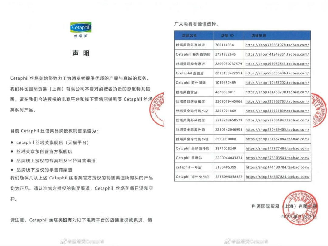 Zelens并非个例,近期,丝塔芙在一份声明中明确,其品牌授权销售渠道仅为ceptaphil丝塔芙旗舰店(天猫平台)、丝塔芙京东自营官方旗舰店、品牌线上授权的专卖店及平台自营渠道、品牌线下授权的零售商渠道,并公开了15家非官方授权店铺名单。丝芙兰表示,没有对这15家电商平台的店铺授权或供货,并提醒广大消费者谨慎选择。