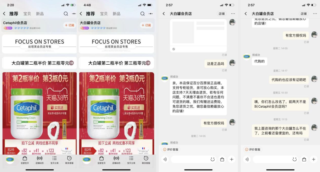 青眼发现,这家淘宝ceptaphil会员店并不在上述15家的“黑名单”内,为了解真实情况,青眼咨询其“是否有官方授权”,对方客服只回复“保证百分百原装正品,并支持专柜验货”。然而仅隔两天,这家店铺就已改名为“大白罐会员店”,上述大白罐产品也已下架。对于为何改名和下架产品一事,截止目前,商家暂未回复。