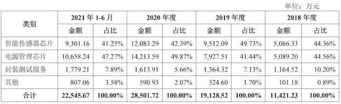 灿瑞科技系主要从事高性能数模混合集成电路及模拟集成电路研发设计、封装测试和销售的高新技术企业,智能传感器芯片和电源管理芯片分别占据灿瑞科技主营业务的半壁江山,此外公司还提供部分封装测试服务及其他。