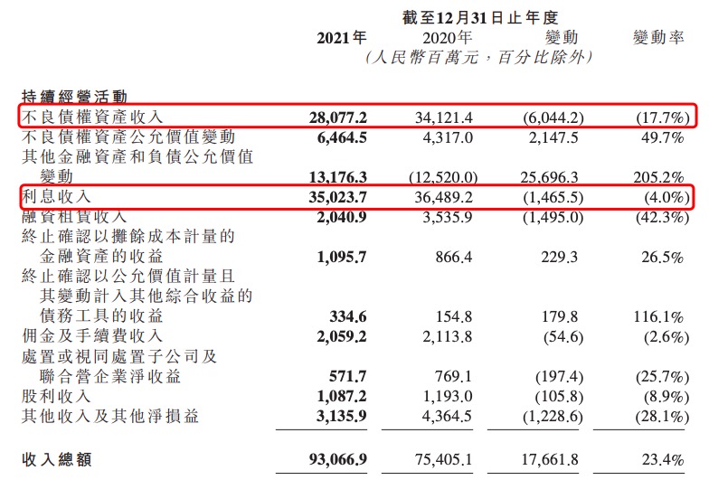 剖析其业绩报表,界面新闻记者关注到,2021年,中国华融不良债权资产收入、利息收入保持较大收入贡献,其中,利息收入占收入总额比重最高;不良债权资产公允价值变动、其他金融资产和负债公允价值变动较上年增长。