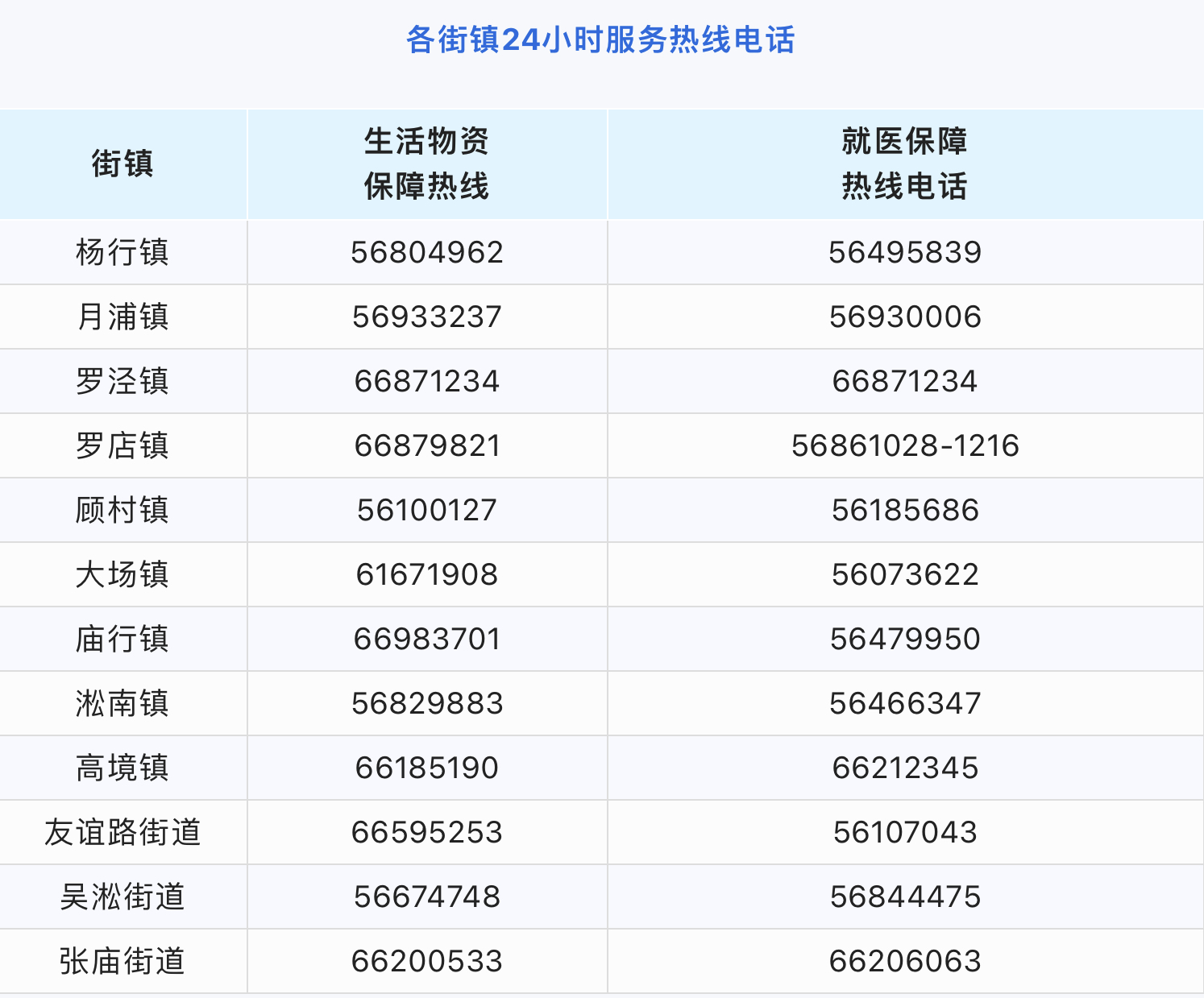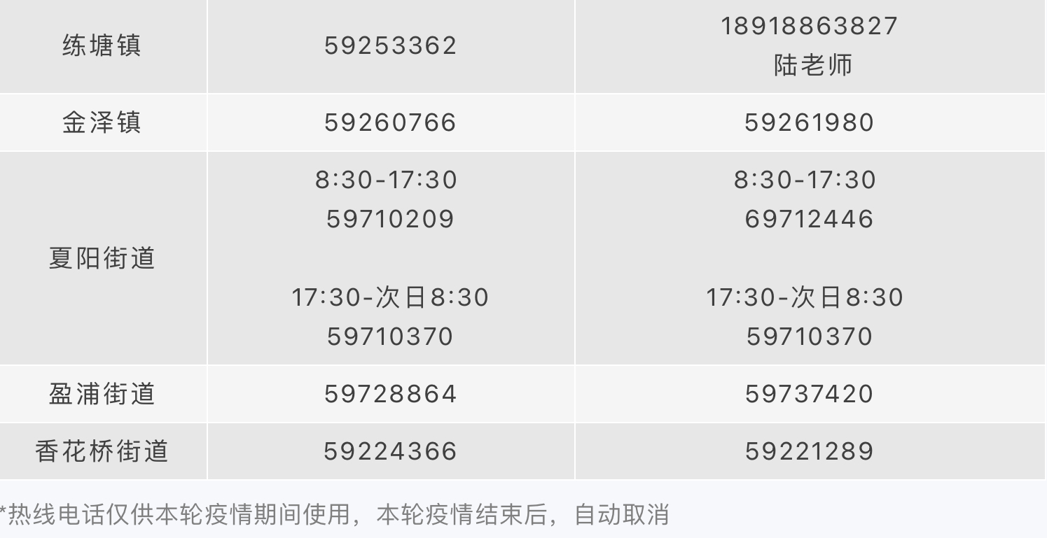 青浦区落实了各街镇24小时热线服务电话,及时响应居民朋友诉求,为大家解决封控期间的急难愁问题。更多的权威资讯和便民信息您可关注“绿色青浦”微信公众号。