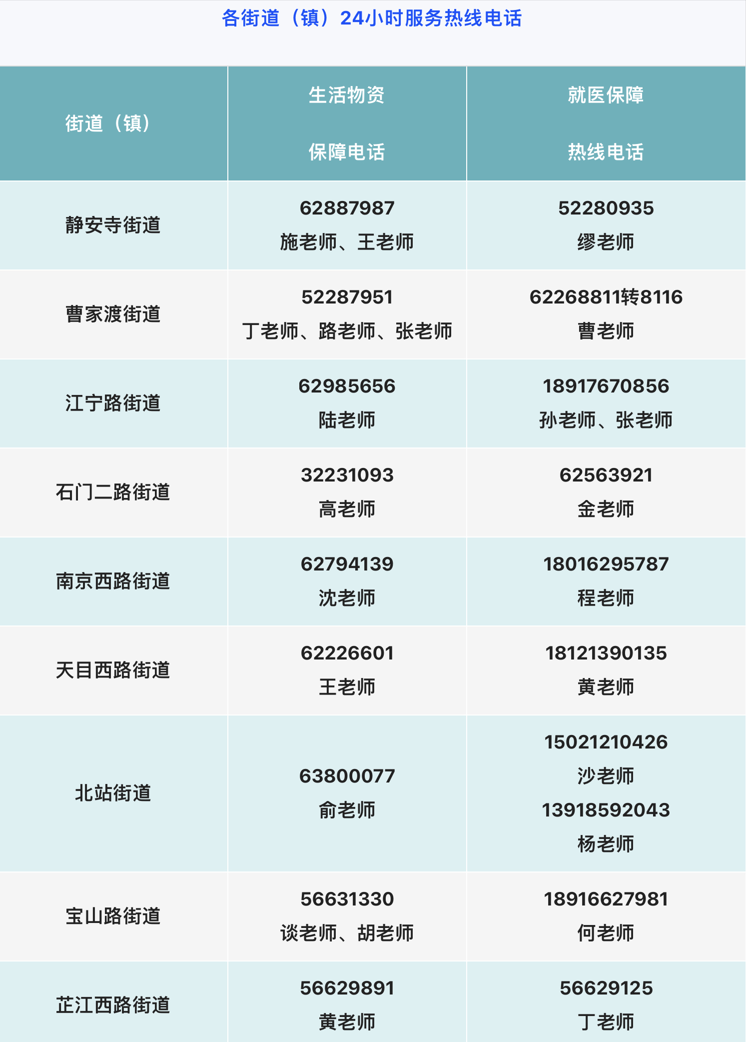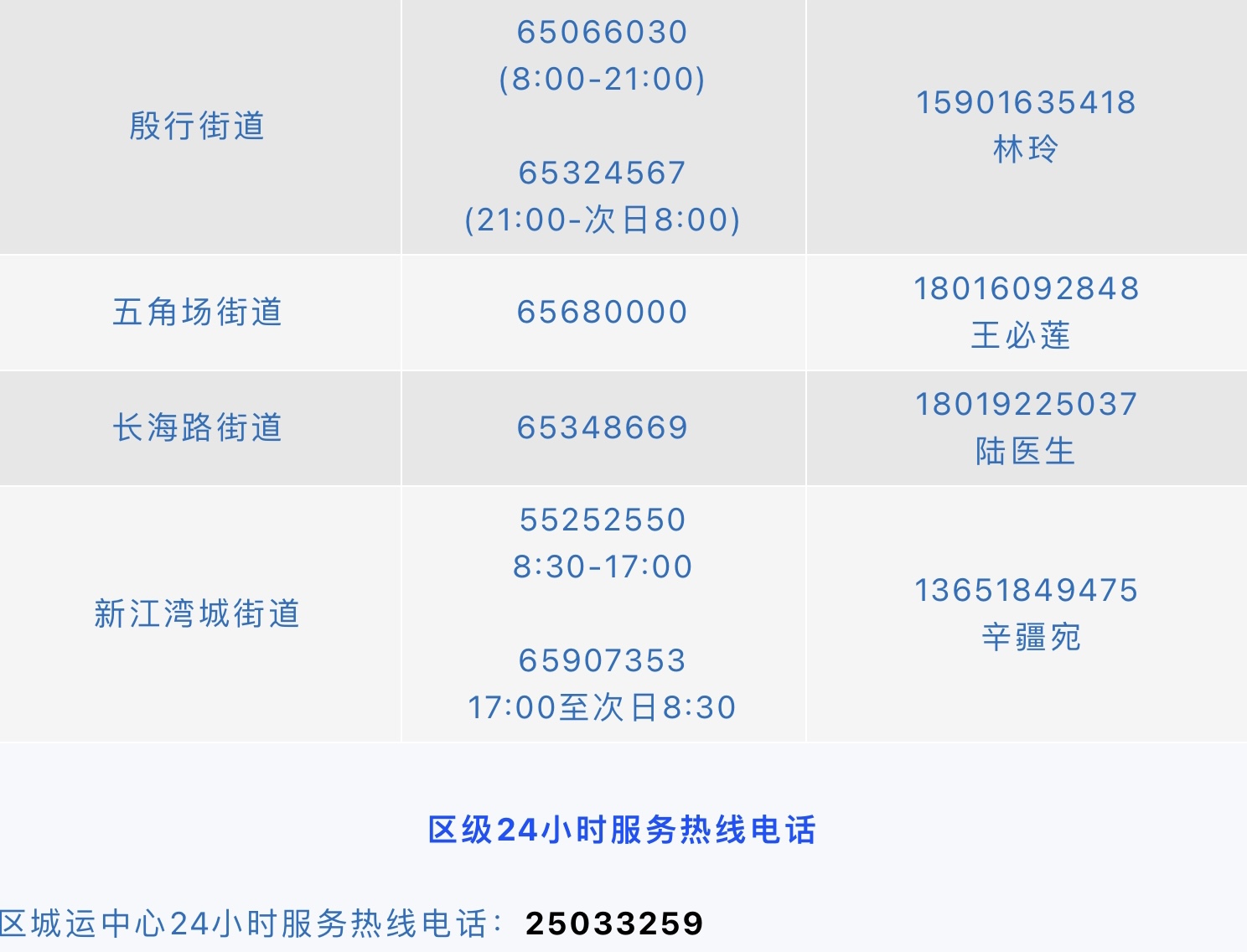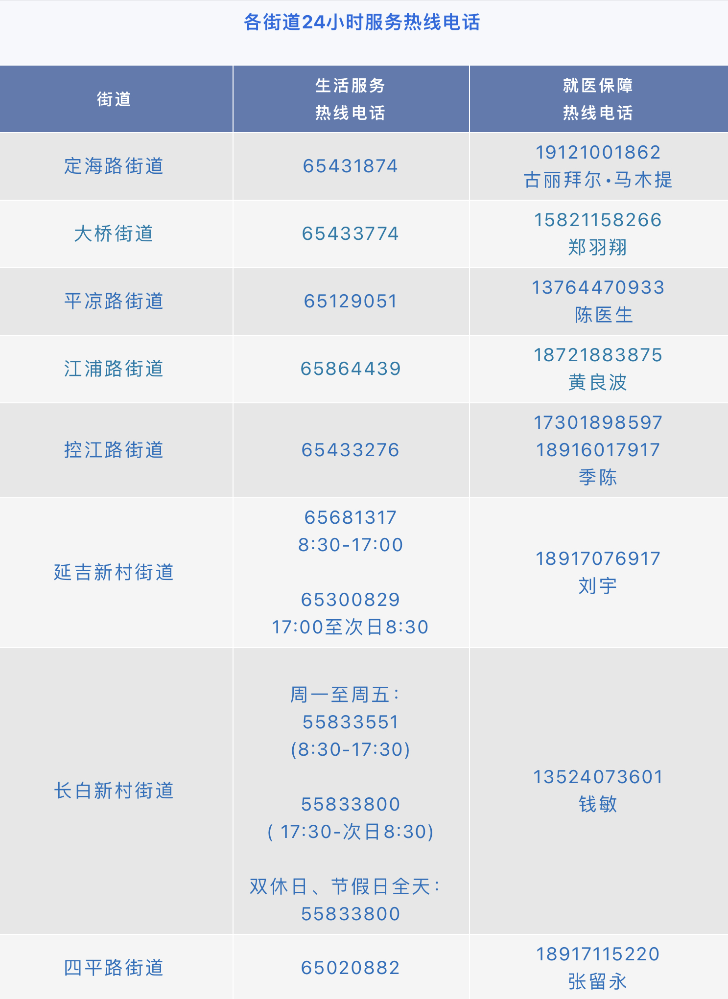 各街道疫情防控期间,为民服务热线电话如下。