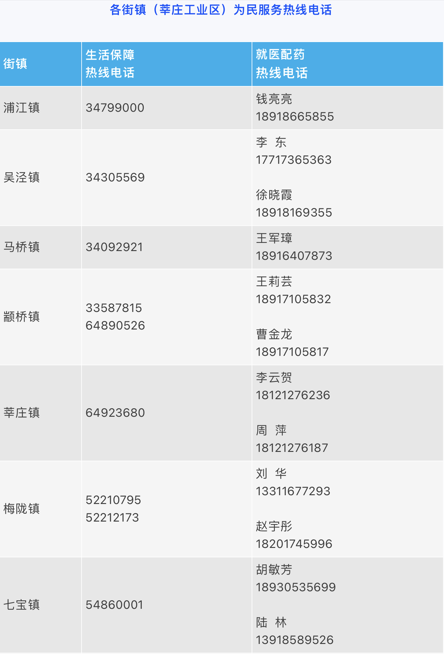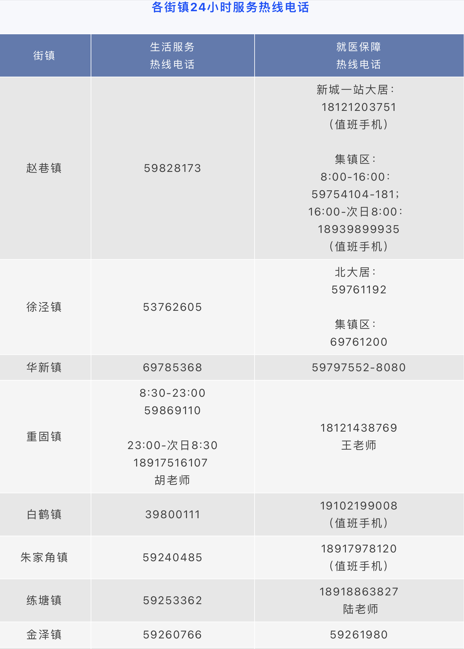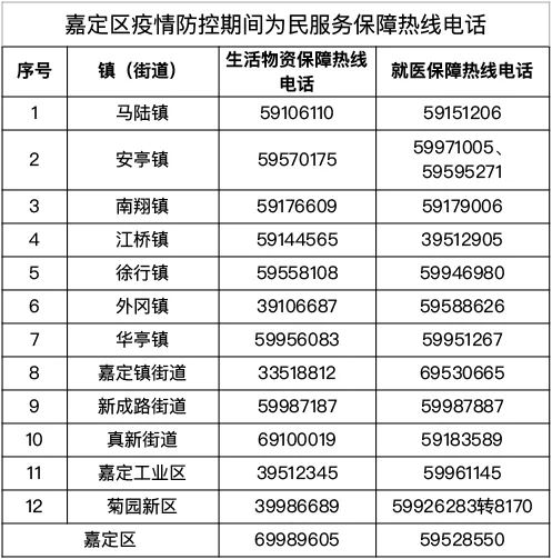 各街镇生活服务热线电话