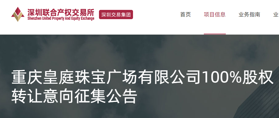 近日,深圳联合产权交易所对外发布了《重庆皇庭珠宝广场有限公司100%股权转让意向征集公告》。转让方为深圳皇庭国际,转让参考价为人民币7.65亿元,挂牌时间为3月25日-3月31日。