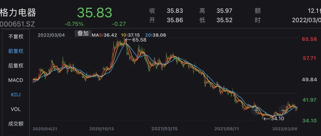 2020年12月以来,格力的股价持续走低。近两年,格力电器抛出多个股票回购计划,并持续进行高比例分红,但并未挽回股价下跌的趋势。截至2022年3月4日,格力电器股价股价跌至35.83元/股,远低于当初46.17元/股的收购价格。