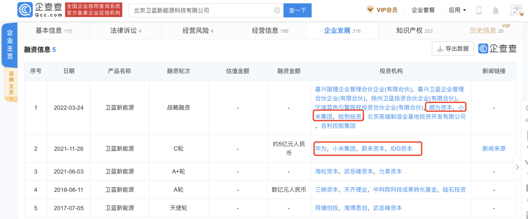 ▲华为小米多次投资卫蓝新能源