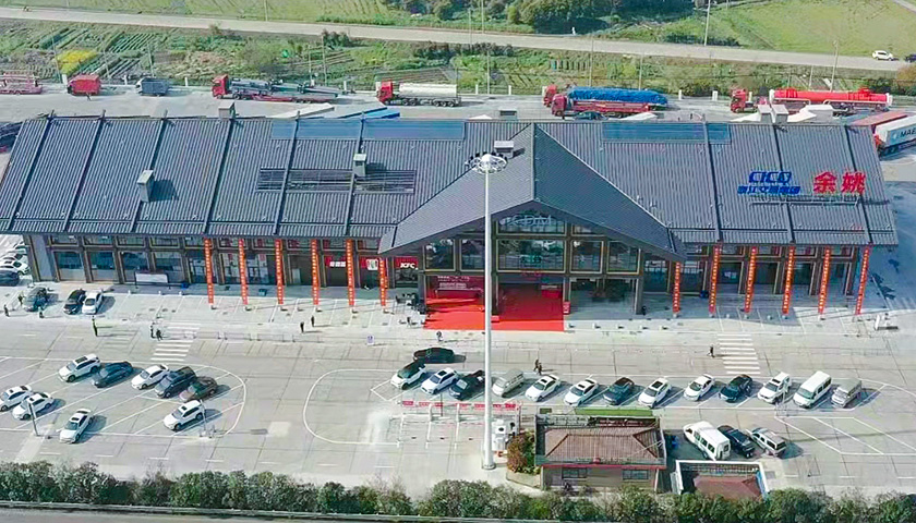 服务区南区占地 63 亩,新建成的综合楼建 筑面积提升至 5853 平方米,停车位数量增加至 154个。服务区外观 设计以“古渡新驿 姚江明珠”为主题,吸纳融入了诸多本地特色元素:以颇具江南风格的黛色和木色为主调,将河姆渡干栏式建筑特点 与当地盛产的竹子相结合,打造成为独具余姚特色的高速服务区。