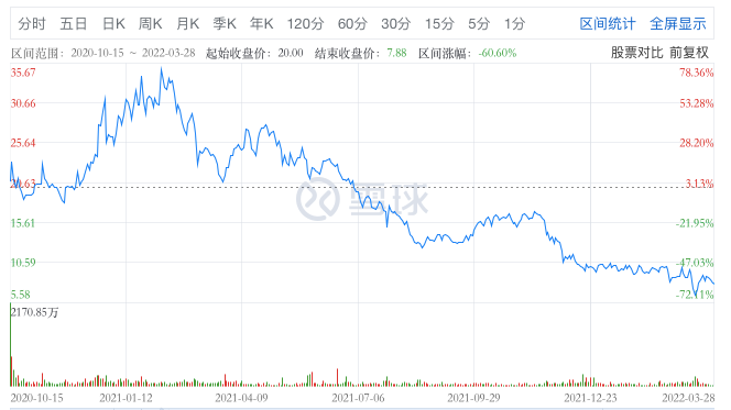 然而没过多久,名创优品便迎来了至暗时刻,而且至今仍未走出。截至2022年3月28日收盘,名创优品的股价为每股7.88美元,总市值暴跌60.6%至24.14亿美元。