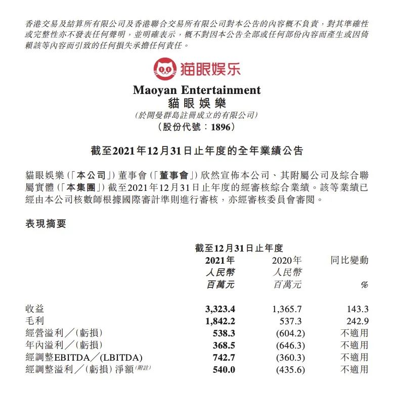 2021年猫眼业绩的突增,不是一种可持续现象,2022年的猫眼很难再复制这样的成功。