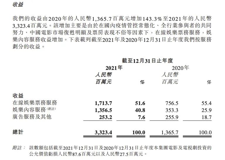 首先最重要的板块是娱乐内容服务,这部分内容可以理解为猫眼用自身的平台能力参与上游内容投资出品,或者参与中游的宣传和发行业务,这一块一直是猫眼想要极力拓展的业务。