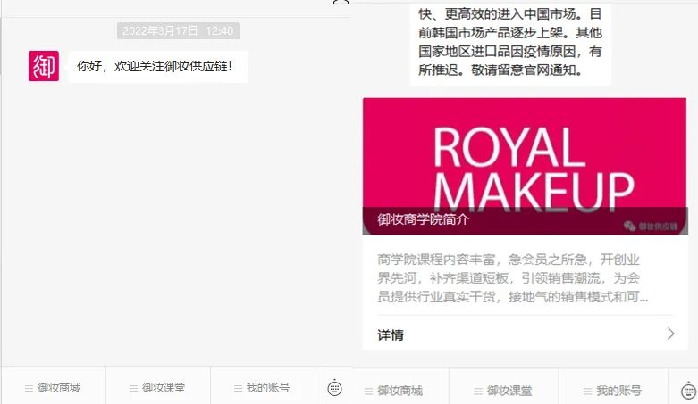 值得一提的是,C2CC传媒记者在其公众号发现,还有御妆商学院的入口,据悉,该商学院的目的是为御妆供应链的会员,提供行业真实干货,接地气的销售模式和可落地的执行方案,以期配合供应链平台的优势,为实体店零售实现流量、销售等多层面的赋能,补齐渠道的短板。