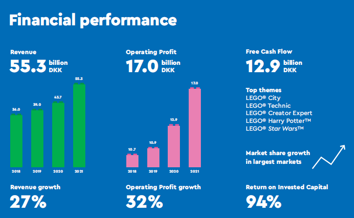 2021年,乐高的收入、营业利润、商品销售额均以两位数增长。净利润率达到24%,为历史最高水平。投入资本回报率高达94%,而过去五年都在60%-80%之间。