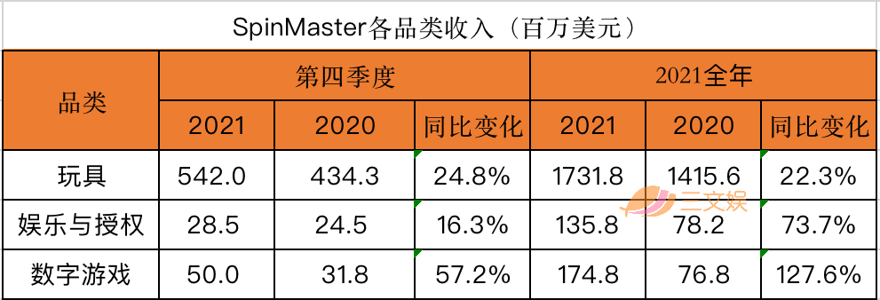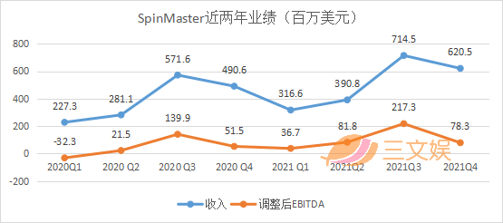 2021年第四季度,Spin Master营收增长26.5%至6.2亿美元;调整后EBITDA为7830万美元,2020年同期为5150万美元。