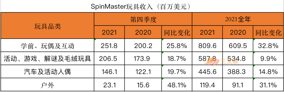 Spin Master的学前类玩具四季度卖出2.52亿美元,全年卖出8.1亿美元,相比2020年增长32.8%。